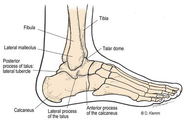 The Talus and Calcaneous are located on the posterior aspect of the foot. The talus consists of the body, neck and head and articulates with the calcaneous and navicular. It is only the foot bone that articulates with the fibula and tibia malleoli, and it consists of posterior, lateral and medial facets.